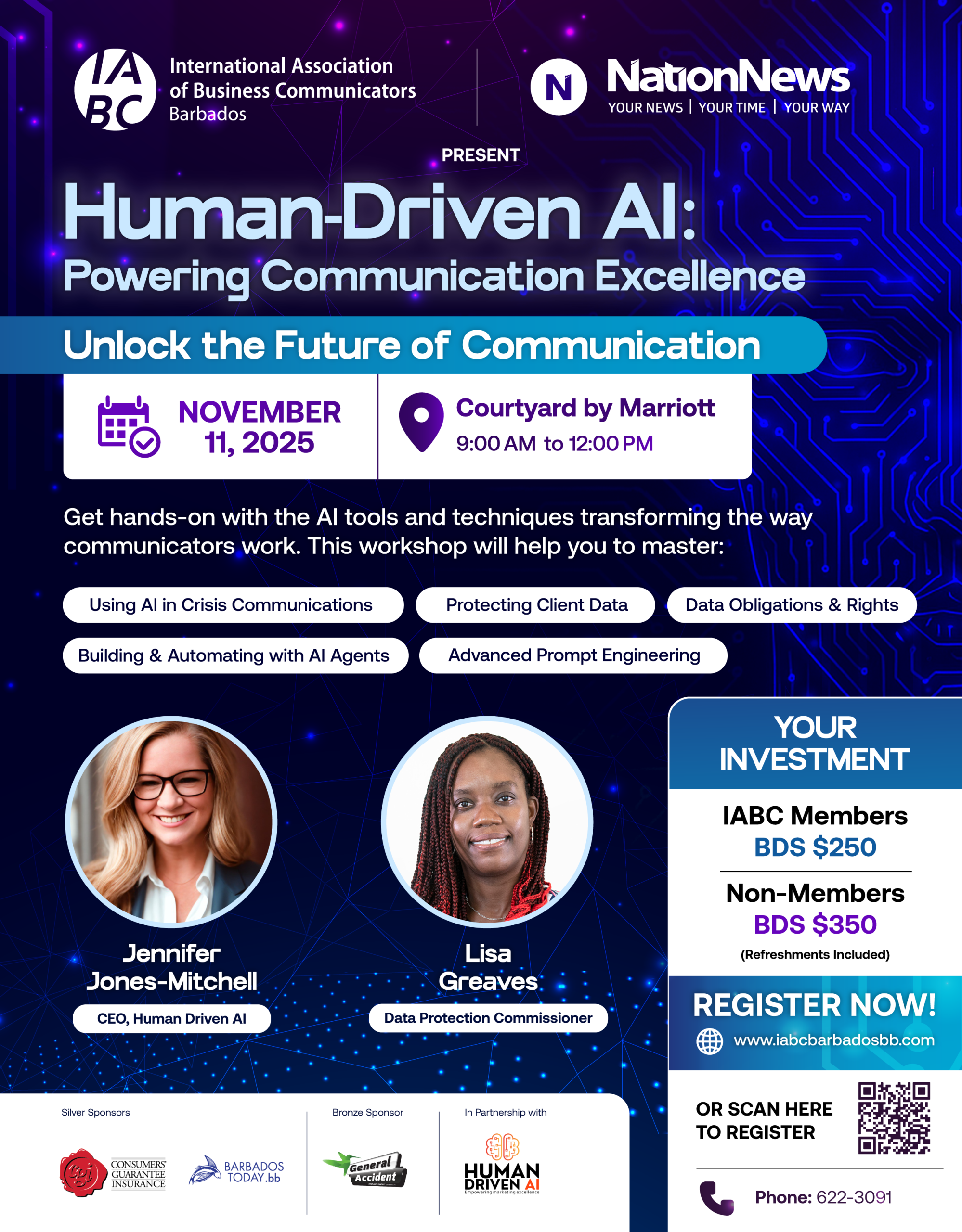 The International Association of Business Communicators (IABC) Barbados, in collaboration with Human Driven AI, will host “AI for Communication Excellence” on Tuesday, November 11, 2025, from 9:00 a.m. to 12:00 p.m. at the Courtyard by Marriott. This high-impact masterclass, led by Jennifer Jones-Mitchell, Chief Executive Officer of Human Driven AI, is designed to empower communication professionals with the practical AI skills reshaping global communication.